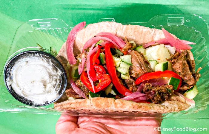 We tried two new plant-based dishes at Sunshine Seasons, and while we REALLY enjoyed one dish, the other…was not our favorite. First up is the Jackfruit Gyro, which is made with jackfruit served with pickled onions, red peppers, fresh cucumbers, and tzatziki sauce on a pita. While we did enjoy the onions and cucumbers, that’s about all we liked. This dish is served cold, and we wished the jackfruit had more seasoning.