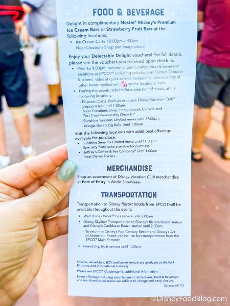 And, we only saw one cart giving out the unlimited Mickey Premium Bars and Strawberry Bars during the event. None of the snack carts you usually find in EPCOT were open except for the regular popcorn stands. Overall, it seemed like Cast Members couldn’t keep up with the way the event was set up, so hopefully that will be worked out for future events!
