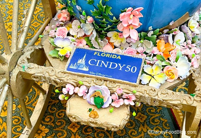 And, to celebrate Disney World’s 50th anniversary, the carriage also has a Florida license plate that says “CINDY50.” The design is modeled after the ACTUAL 50th Anniversary license plate that Florida residents can get! Also, take a closer look at those flowers — each has been created by hand!