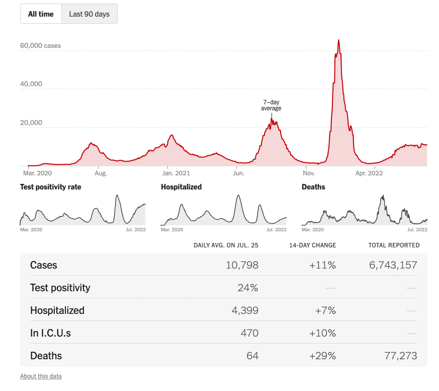 According to a chart from Google, made using data from the New York Times, as of July 31st, 2022 the 7-day case number average was 124,312. That’s much less than the 739,002 7-day average seen back on January 24th, 2022, but it is more than some of the numbers seen in March and April.
