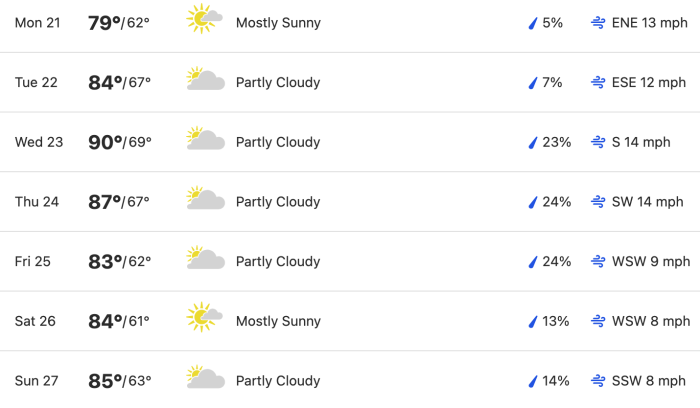 Here is a full overview of the week from The Weather Channel. The temperature will range between 79° and 90° during the day, then drop to the 60s at night. Keep in mind that the weather predictions can change, but for now, this overview should give you an idea of what to expect for the week.
