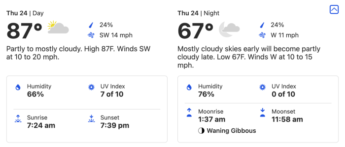 On Thursday, March 24th, the temperature reaches 87°. The low is 67°, with 60-70% (ish) humidity throughout the day. The wind is predicted to come in at 10 to 20 mph, and there’s a pretty low chance of rain. We’ll take it!