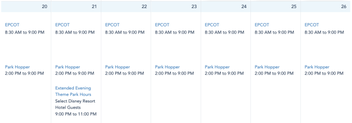 It’s time for another weekly roundup of park hours and Park Pass Reservation availability in Disney World!