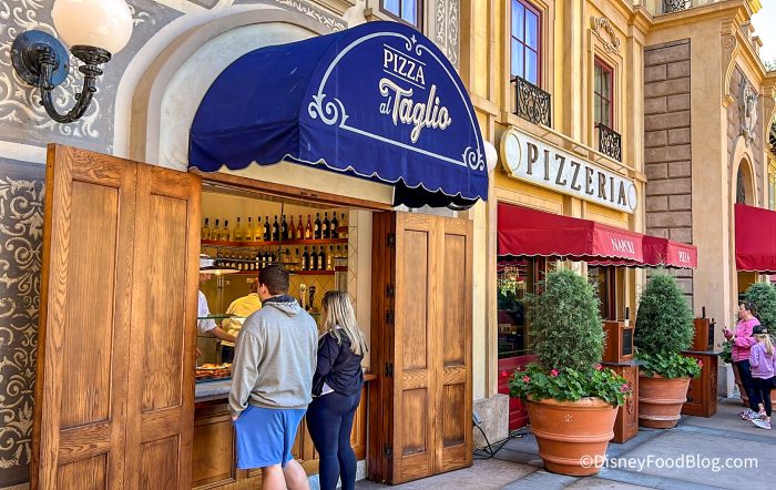 The Pizza al Taglio pizza window was open this week in EPCOT! This is one of those Disney World spots that isn’t always available, and its schedule can be unpredictable. You can’t get the full Via Napoli menu here, but you can order some delicious pepperoni and cheese pizza slices!