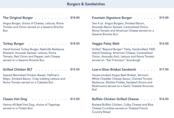…whereas The Fountain has quite a few more entree options, including several different burger options, a Classic Hot Dog for $12, a Grilled Chicken BLT for $15.50, and more. The Fountain’s prices for burgers are about the same as Beaches & Cream, and there are a few more options for a range of palettes. The Fountain’s menu also includes salads, if you want to eat some greens before nomming on ice cream.