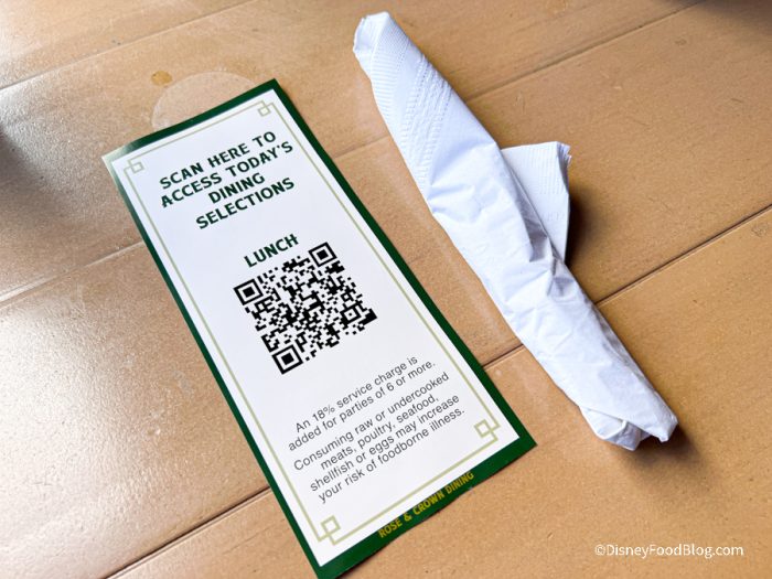 Your place setting is a QR code menu and a paper napkin with a set of utensils.