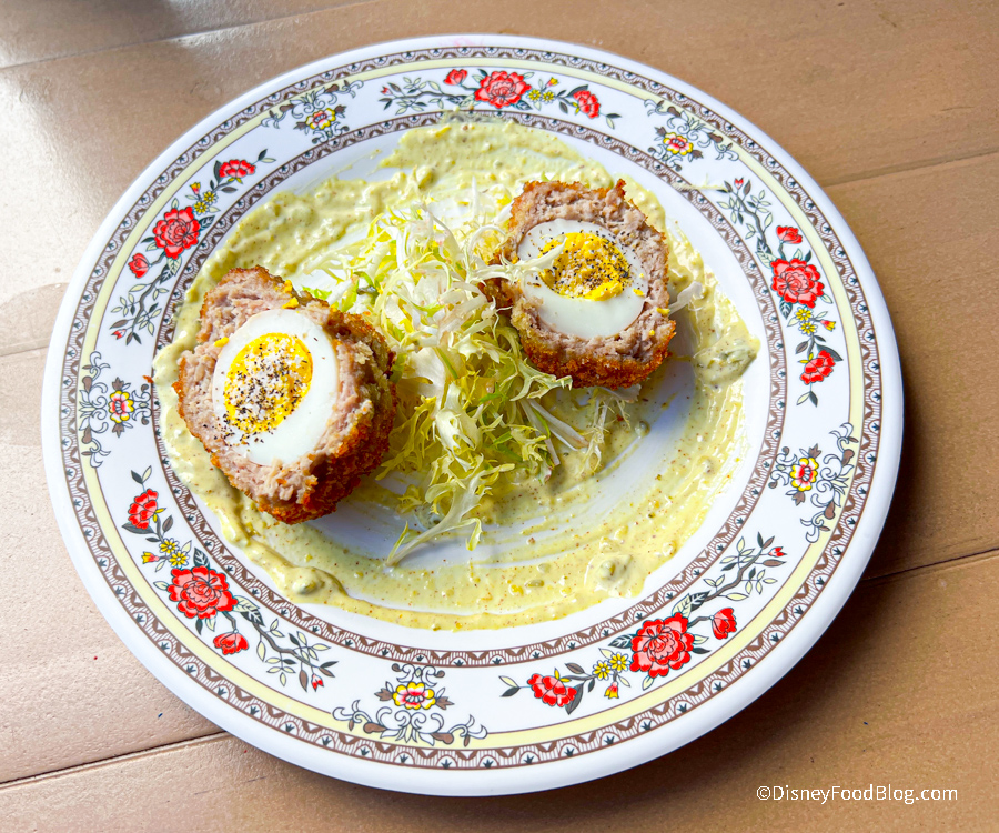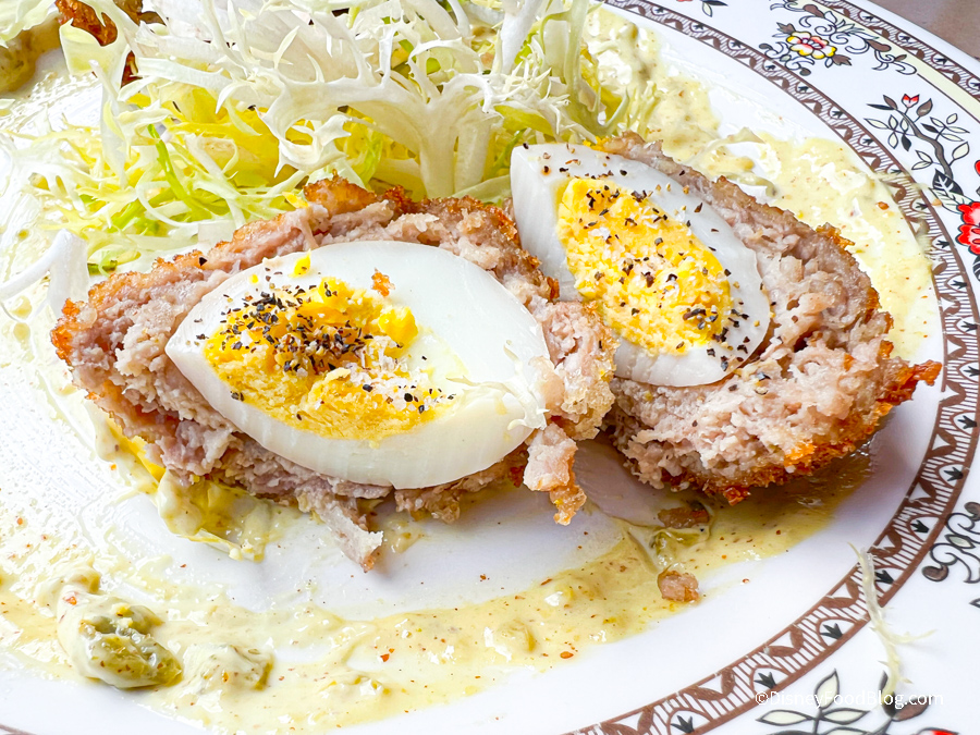 This eat is a Golden-fried Hard-boiled Cage-free Egg wrapped in Sausage with Mustard Sauce.