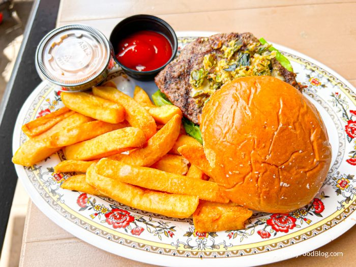 This mostly classic burger is an Angus Beef Patty with Beer Cheese Sauce, Bacon, and Beer-battered Leeks served with a side of Branston Mayonnaise.