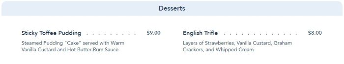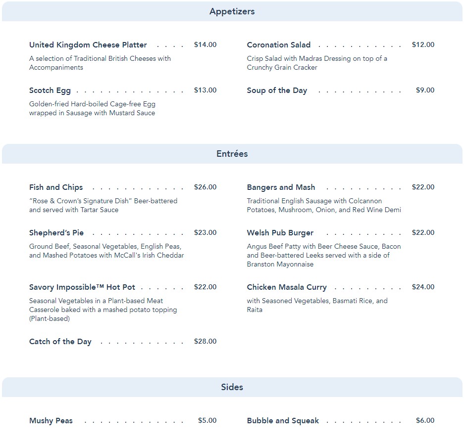 Let’s take a look at the lunch menu full of British favorites! The menu is mostly unchanged from our last visit last year. There are a few small Appetizer options and a small but mighty selection of British Entrees. The Sides choices are limited but can be a good addition to a meal.