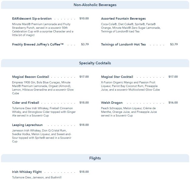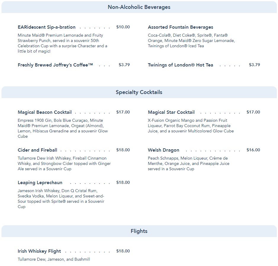 Now let’s talk about those DRINKS. This is a pub after all! You’ve got a selection of Non-Alcoholic Beverages, but you can go for some Specialty Cocktails as well and even an Irish Whiskey Flight!