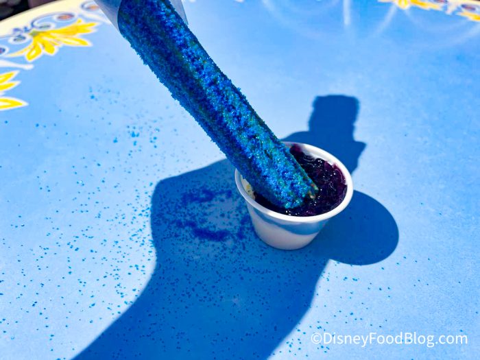 It is a blueberry-flavored sugar-dusted churro that is paired with a dip made of blueberry fruit topping and cream cheese icing. Disney was not lying when they said blue churro — it was and electric blue color and was all over our mouths and hands after eating it!