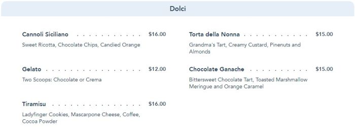 Once you’ve chowed down on cheeses and pastas, you can finish up with the Dolci course. That’s dessert!