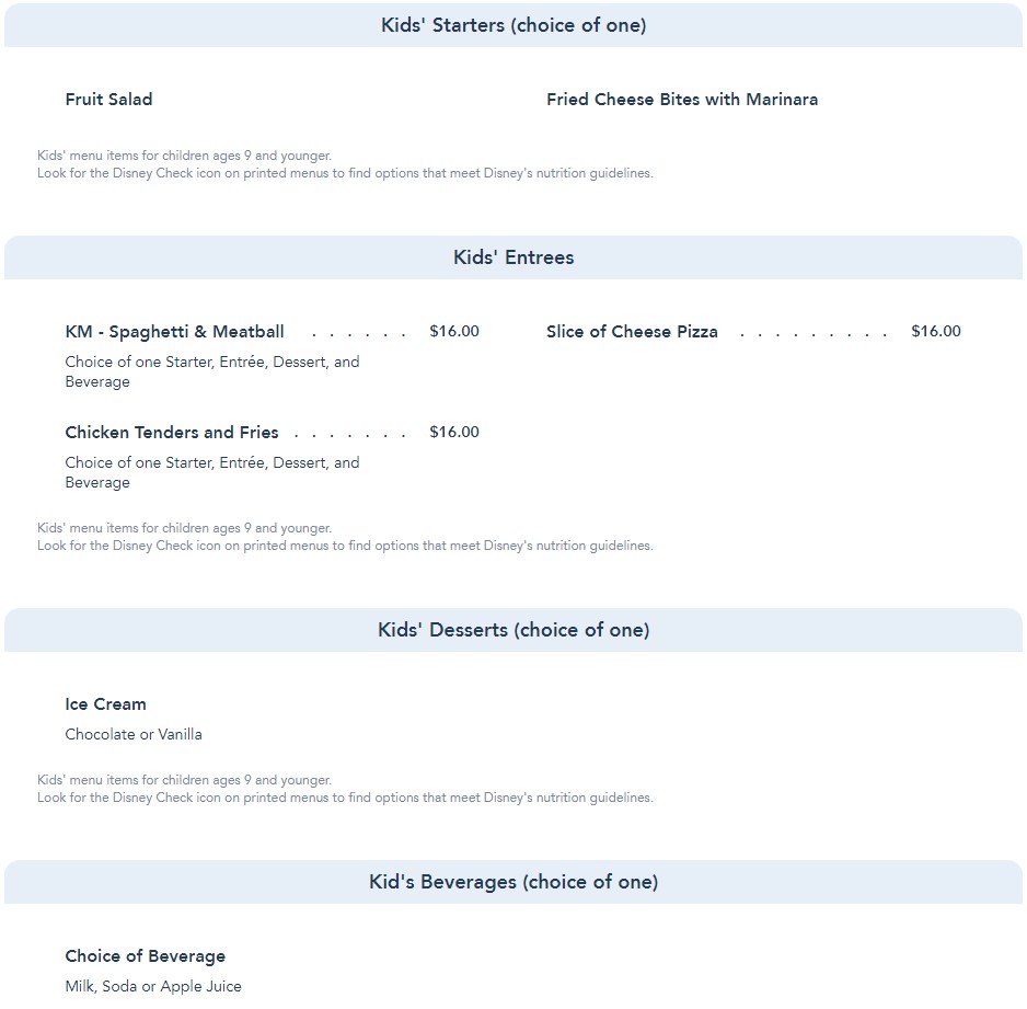 Kids have a limited menu with basic options like Spaghetti & Meatball and a Slice of Cheese Pizza.