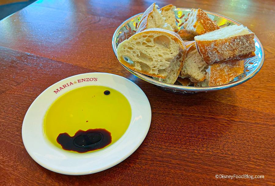 So, let’s dive into what we ate! Maria & Enzo’s features a bread course of beautifully sliced baguette served with olive oil.