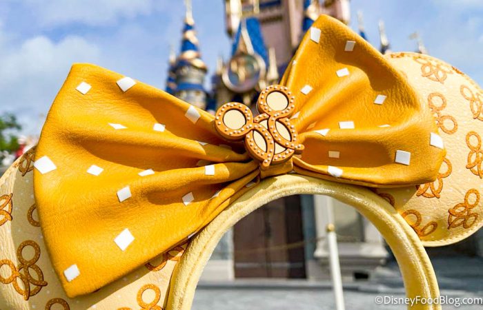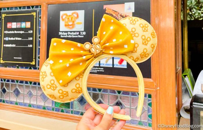The ears are a pastel yellow color with a pattern of Mickey-shaped pretzels all over and little “sprinkles of salt” mixed in.