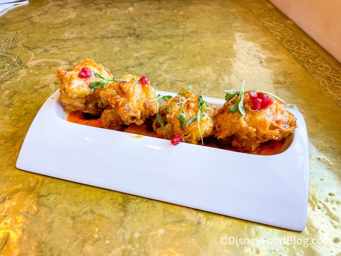 First up is the Pomegranate-Chili Crispy Cauliflower. This is a plant-based dish that is pretty much exactly what it sounds like — pomegranate-chili cauliflower! It comes served on top of a Red Pepper Aleppo Sauce for dipping and costs $11.