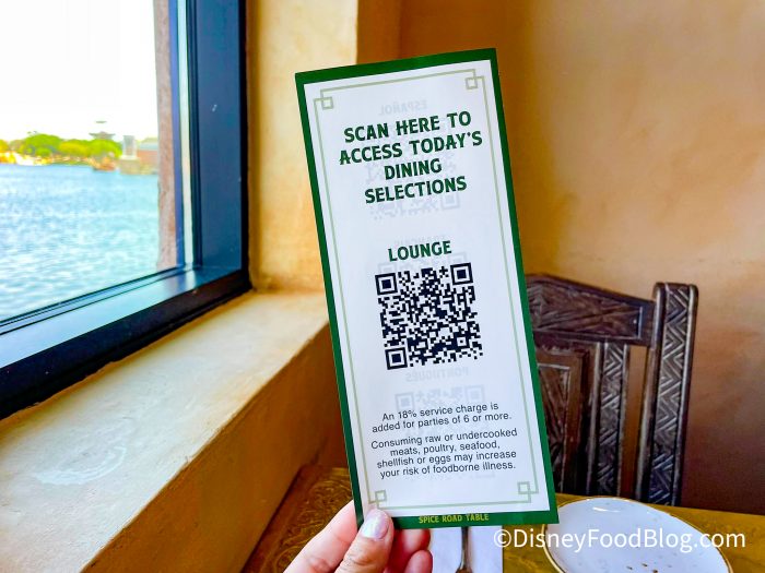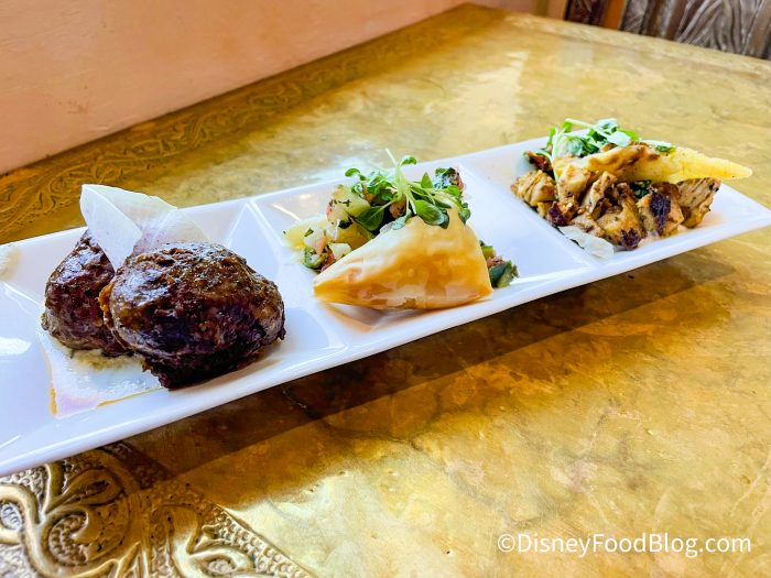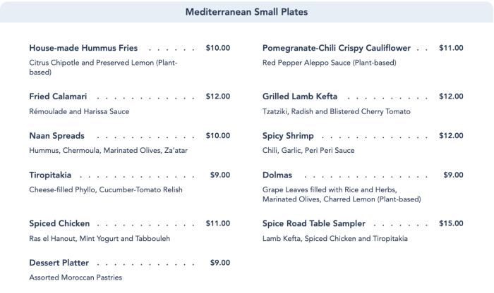 One important thing to note if you haven’t eaten here in a while is that, when Spice Road Table reopened in 2020, the menu completely changed. Rather than being considered a Table Service Restaurant by Disney, it was reclassified as a “Lounge” which resulted in the removal of all the entrees and desserts from the menu. Instead, everything that was previously under the small bites section (and a few desserts), was converted into the main “Mediterranean Small Plates” lounge menu.