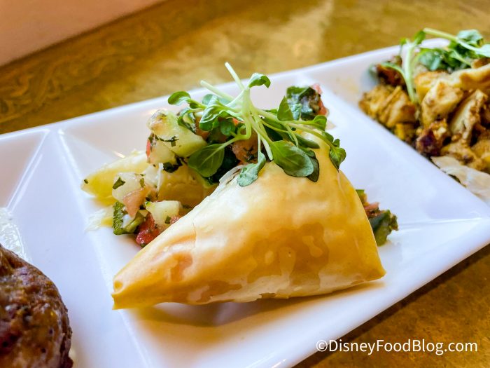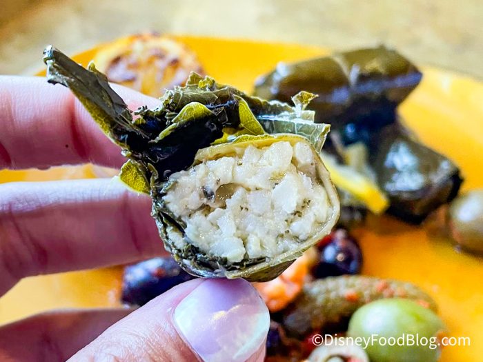 Now, we tend to think of dolmas as a Greek dish, but that doesn’t mean that there’s no place for it in this Moroccan-inspired restaurant! The topping on the grape leaves gives the dish a flavor profile that is very similar to vinegar or lemon, but it’s still very fresh. The rice on the inside offers a citrus flavor and the marinated olives then offer a nice texture to the dish since the dolmas are on the softer side. We’d say that we’ve definitely had better dolmas outside of Disney, but these still stand on their own.