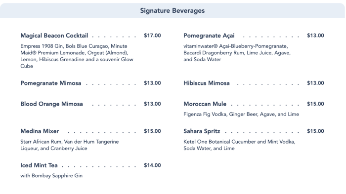 And, if you’d prefer to dine here without opting for something boozy, there is a non-alcoholic beverage section of the menu that still includes some Moroccan-inspired offerings like Iced Mint Tea and a Moroccan Hot Tea Service.