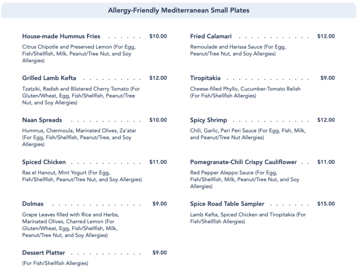 Plus, those with allergies can identify which dishes they can enjoy safely thanks to the Allergy-Friendly menu. If a dish says “for egg, peanut/tree nut, and soy allergies, etc.” that means that it is safe for people with those allergies to enjoy!