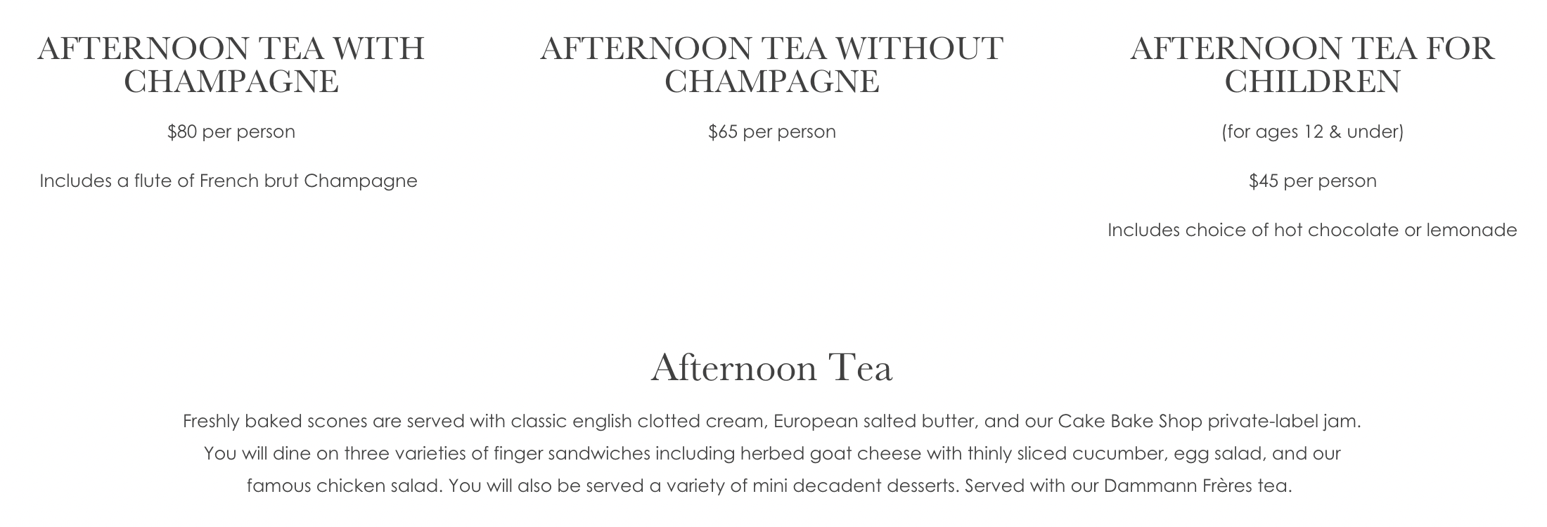 For this price, you get freshly baked scones served with classic English clotted cream, European salted butter, and the Cake Bake Shop private-label jam. Plus, it includes three varieties of finger sandwiches (including herbed goat cheese with thinly sliced cucumber, egg salad, and our famous chicken salad), a variety of mini decadent desserts, and The Cake Bake Shop’s Dammann Frères tea.