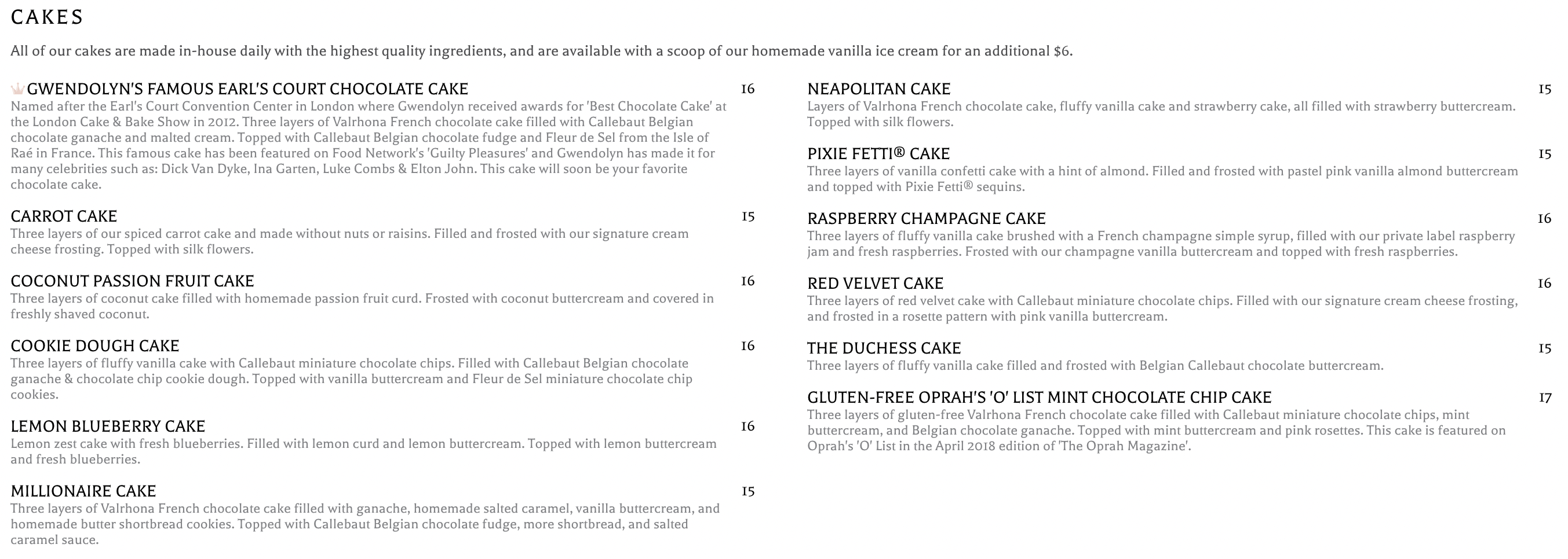 Coming in at the top of the menu are all the cakes and…umm…we’re already drooling. 😜 The signature cake on the menu is Gwendoly’s Famous Earl’s Court Chocolate Cake which is “named after the Earl’s Court Convention Center in London where Gwendolyn received awards for Best Chocolate Cake.” So, we can probably expect this to be one of the best chocolate cakes we’ve ever had.