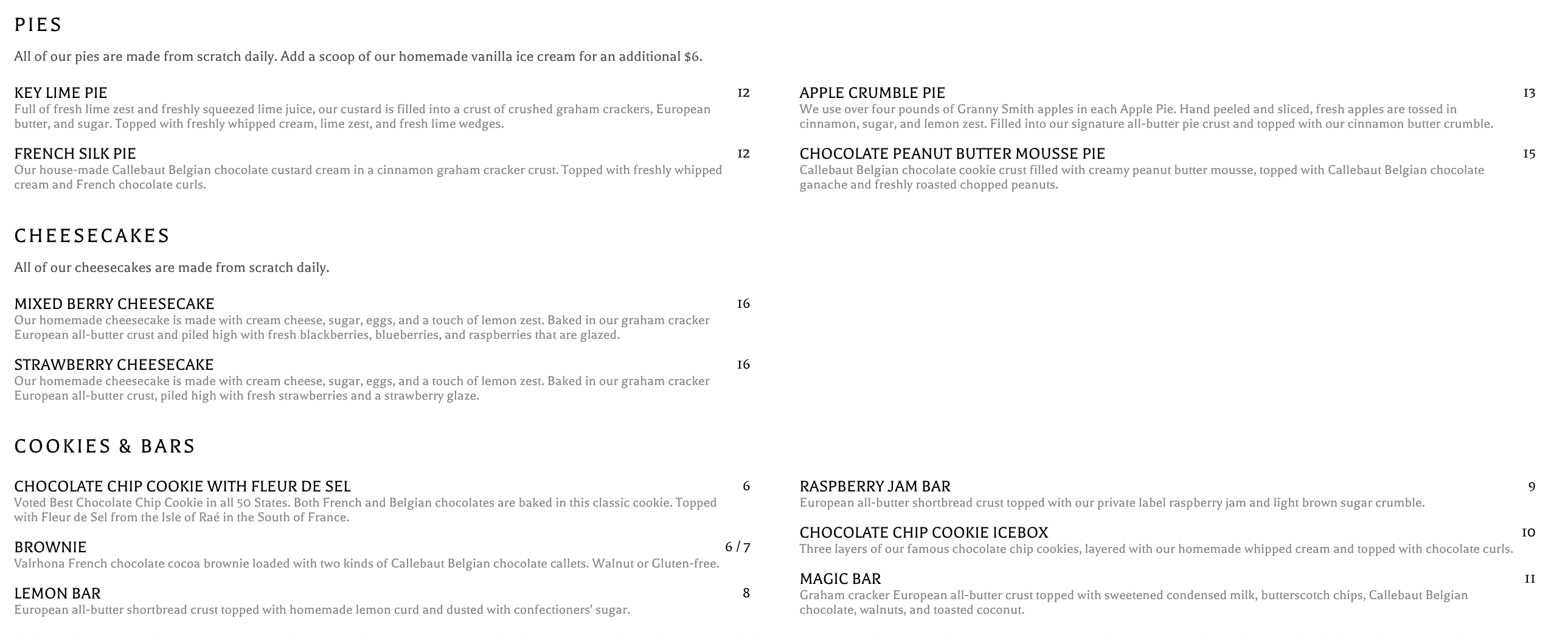 And, while “cake” may be in the name, this bakery is much more than just a cake shop! The menu features a variety of Pies, Cheesecakes, and Cookies & Bars as well! Pies range in price from $12-$15, cheesecakes are $16, and the cookies are bars are priced between $6-$11.