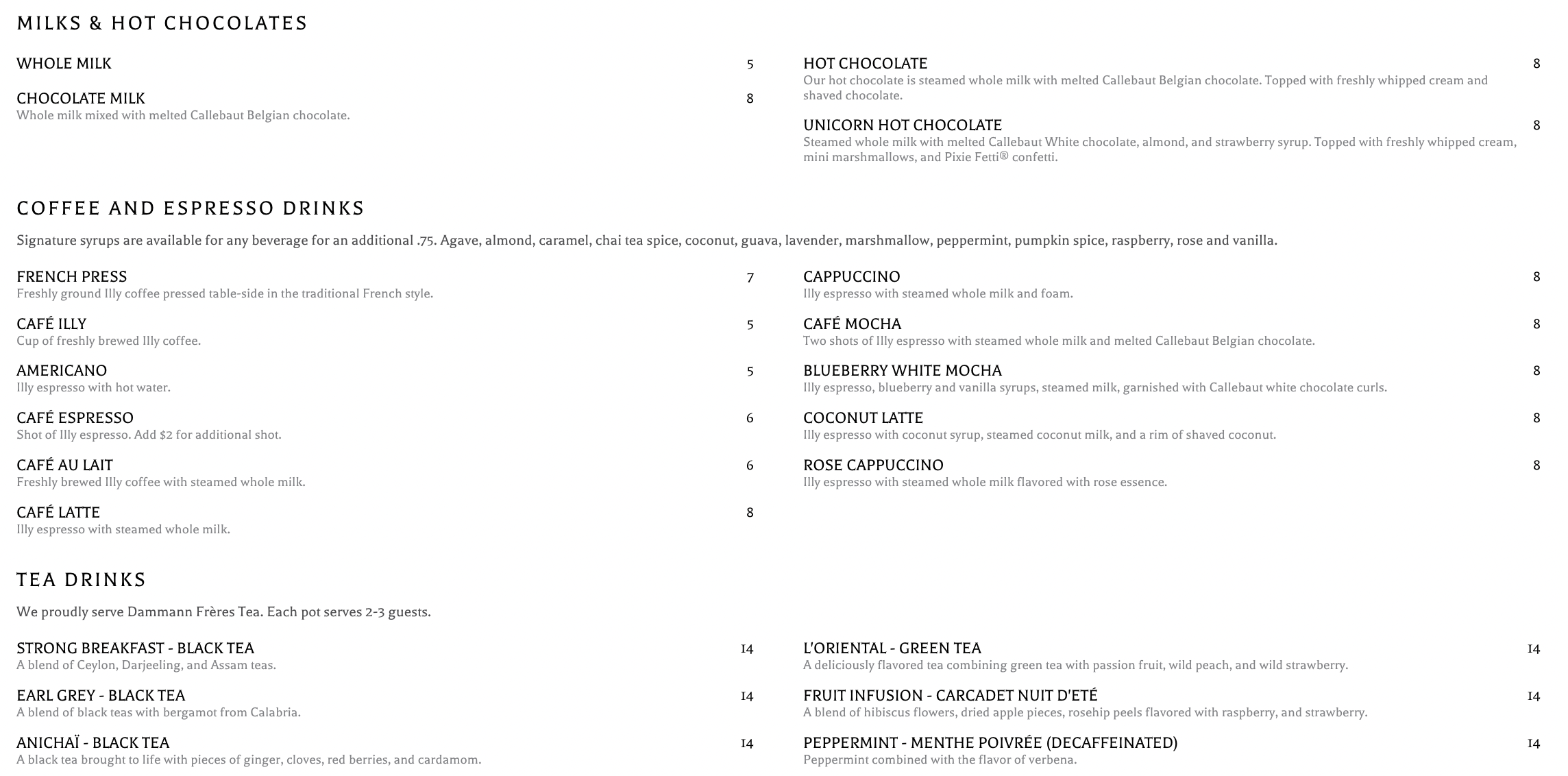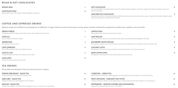 And, to top off the dessert menu, we’ve got a selection of milks & hot chocolates (can we talk about how whimsical the Unicorn Hot Chocolate sounds!?), coffee and espresso drinks, and tea drinks that all cost between $5-$14.
