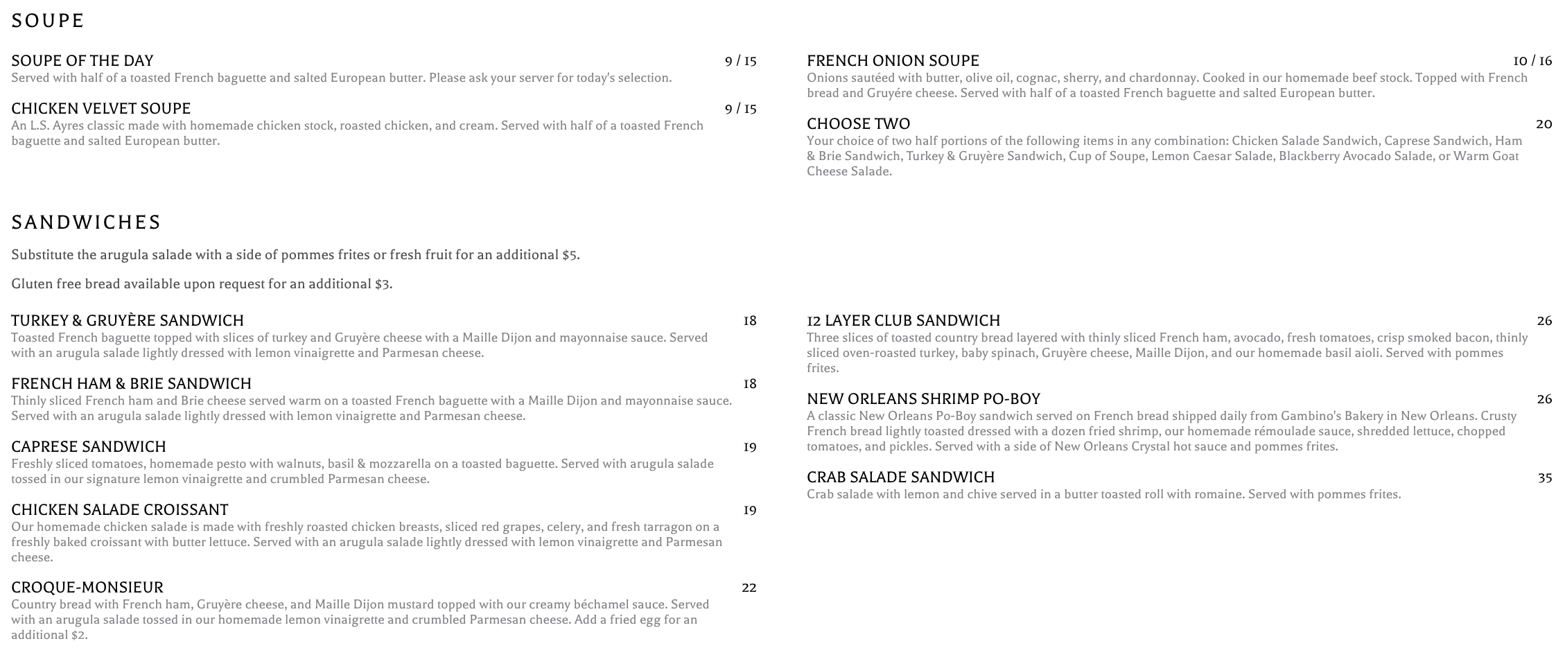 Based on the menu for the locations that are open, it looks like you’ll be able to choose to get a cup or a bowl of soup (costing between $9-16) and there will also be a variety of sandwiches available that come served with fries or fresh fruit (costing between $18-$35). And, if you want the best of both worlds, you can “Choose Two” (soup and salad) for $20.