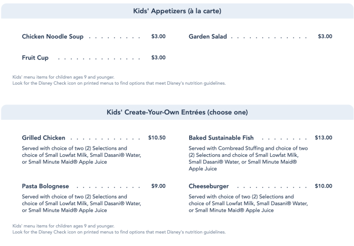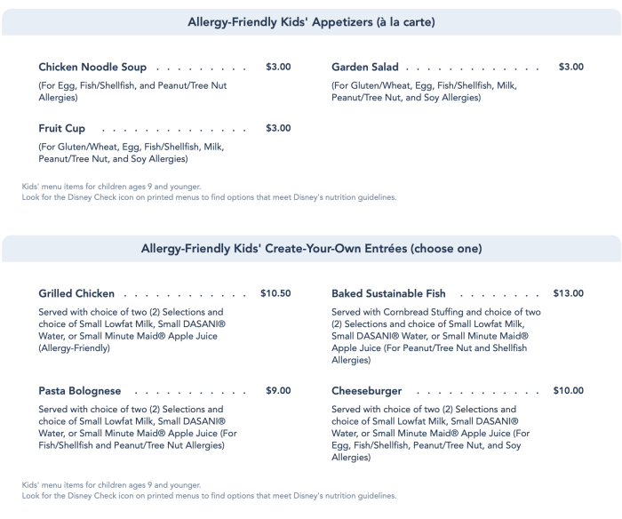 …allergy-friendly kids’ appetizers, kids’ create-your-own entrées…