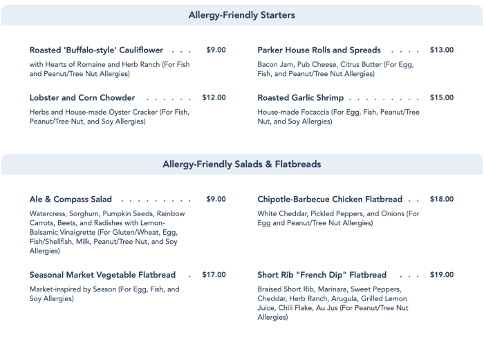 If you’re dining with an allergy, you’ll be able to determine what you can and can’t eat by using the allergy-friendly menu. It features similar starters, salads, flatbreads…