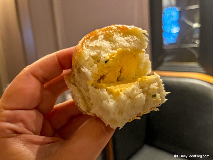 Coming in second place on our spread ranking is the Bacon Jam spread. This one is a delicious savory-sweet combo and it’s obvious that Disney uses real bacon in their jam because it had that delicious flavor that you just can’t get from bacon bits. This spread paired really well with the rolls since both have a nice, salty, and sweet flavor profile.