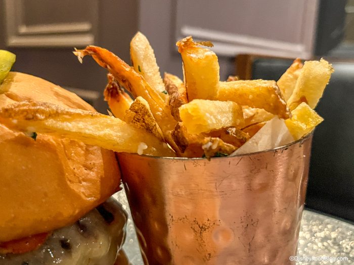 The burger also comes with a side of fries and, while these might look like your typical Disney World fries, look again! These are actually TRUFFLE fries (which automatically makes them better) that are cut and fried fresh at Ale & Compass and it shows. We were a bit surprised that the fries themselves didn’t have any truffle flavor, but the herbed mayo definitely brought the truffliness (is truffliness a word? Well, it is now!).