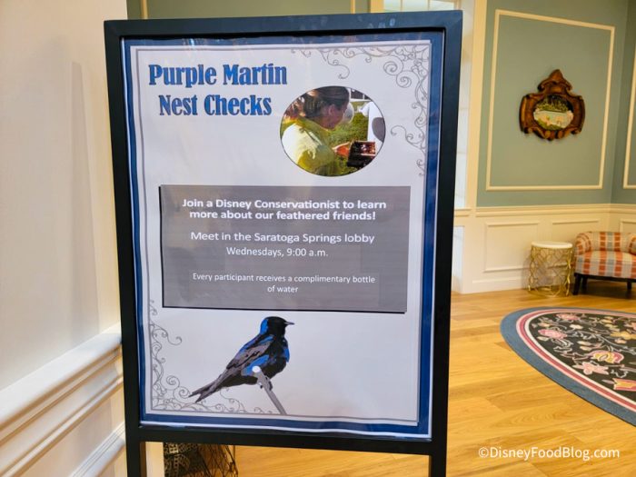 We’ve seen Disney add nest sites (aka free birdie hotel rooms) for the Purple Martins in places like EPCOT, but they can also be spotted at Disney’s Caribbean Beach Resort and Saratoga Springs Resort & Spa. And now, on Wednesday mornings, guests staying at Saratoga Springs can take part in something called a “nest check.”