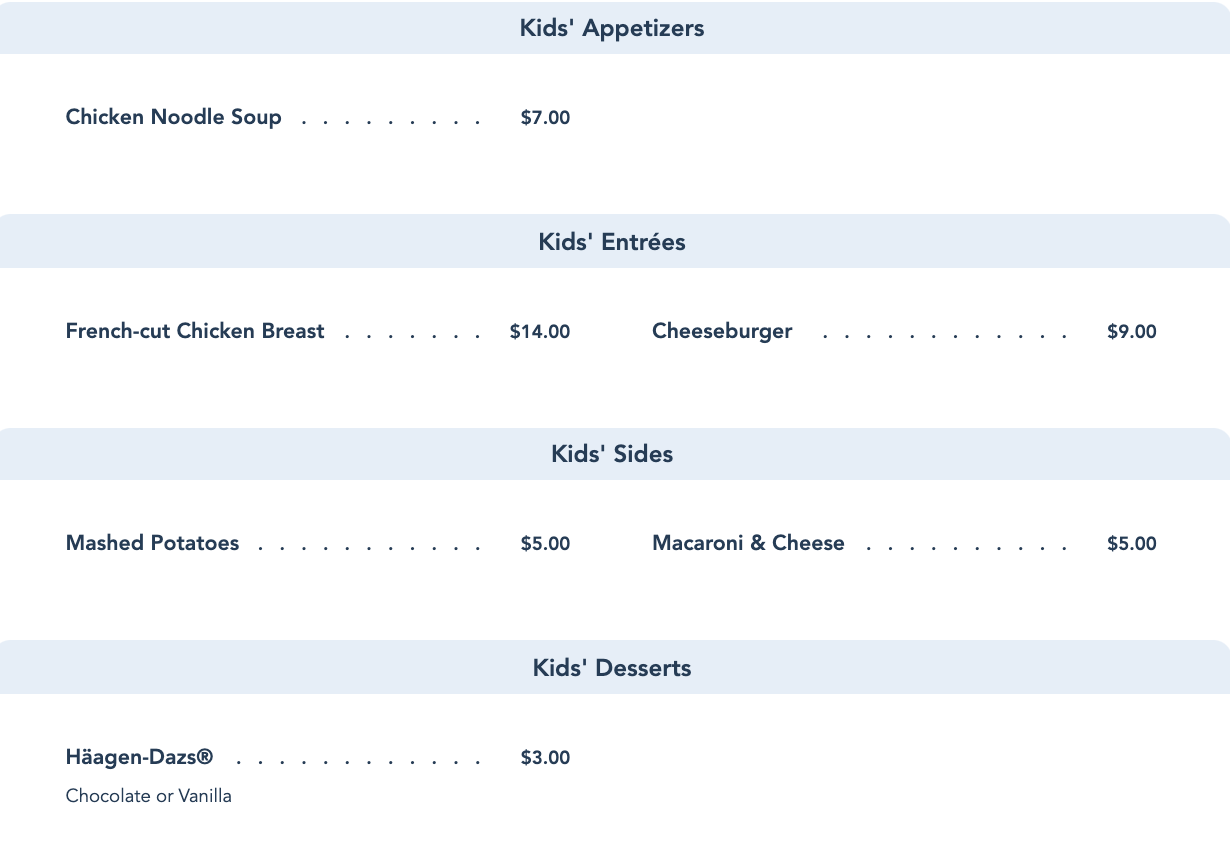 While kids are welcome to dine at Shula’s, their menu options are very limited so that is something to keep in mind. There’s only one option for an appetizer (Chicken Noodle Soup), and your little ones are left with only two entrees: French-cut Chicken Breast or a Cheeseburger.