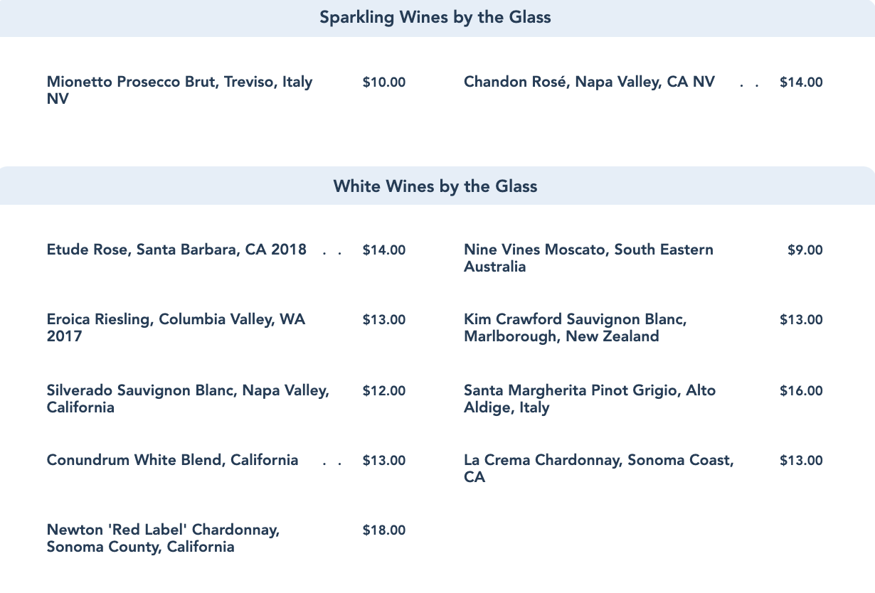 If you prefer wine (remember that giant wine case we talked about earlier?!), there’s a wide selection of Sparkling and White Wine…