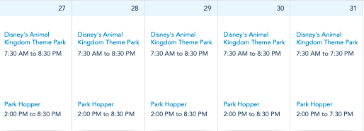 Disney’s Animal Kingdom will be open from 7:30AM until 8:30PM every day this week except for the 31st, when it will only be open until 7:30PM.