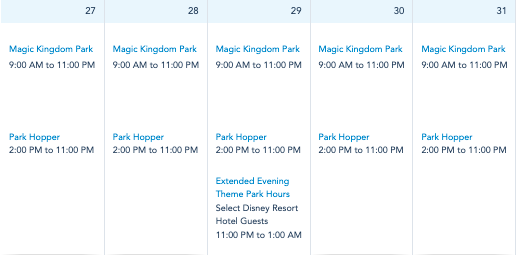 Magic Kingdom is open from 9AM until 11PM every day this week, with Extended Evening Hours for select resort guests on the 29th from 11PM until 1AM!