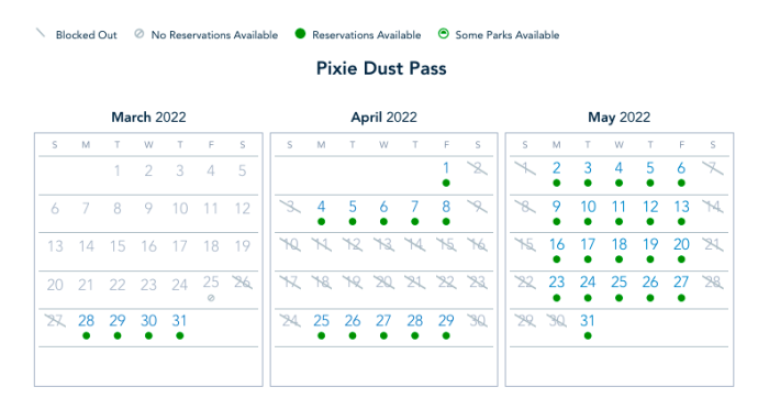 Pixie Dust Pass Holders are blocked out on March 27th and April 2nd, but can make reservations at any of the other parks on March 28th through April 1st.