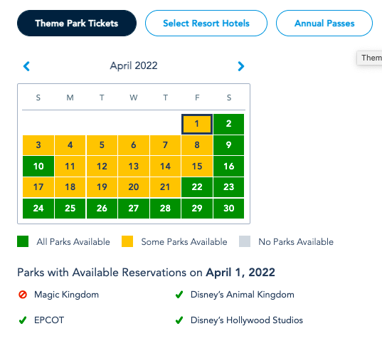 On April 1st, all parks except for Magic Kingdom are available, and all parks are available on the 2nd!