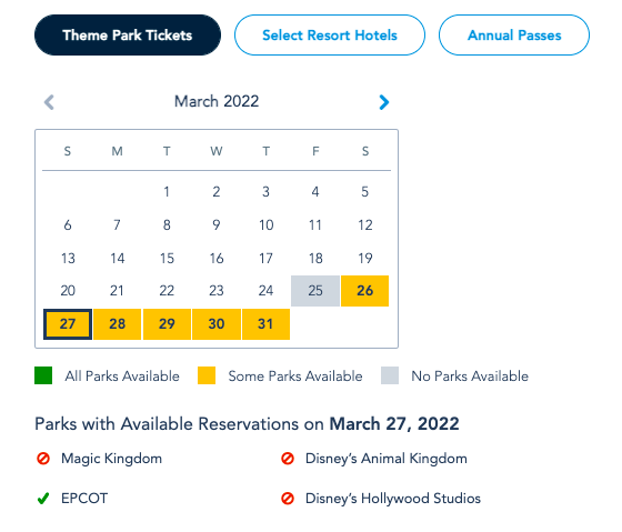 The only park Theme Park Ticket Holders can make a reservation at on March 27th through 31st is EPCOT.