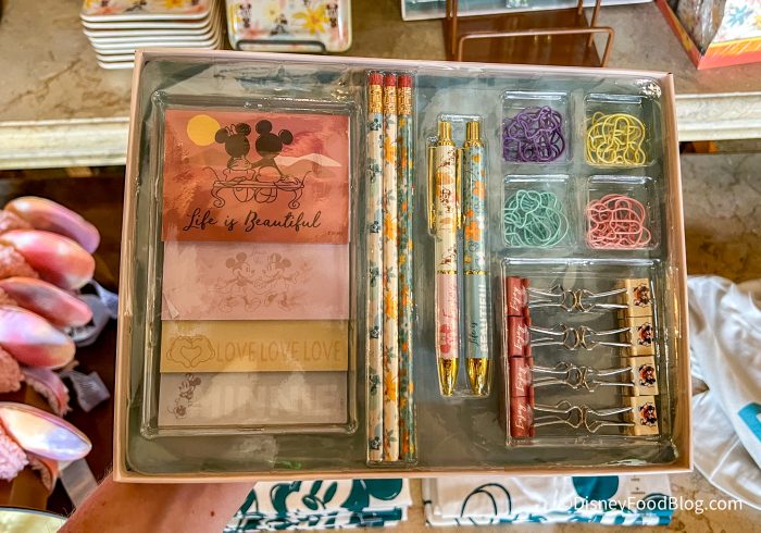 Disney’s new stationery set is $24.99. It features pens, binder clips, sticky notes, pencils, and paper clips!