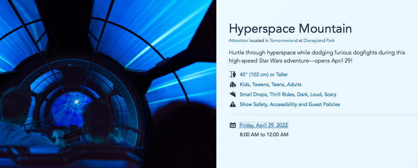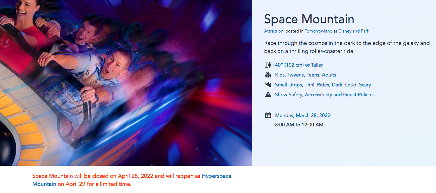 According to the Space Mountain website for Disneyland, Space Mountain will be CLOSED on April 28th, 2022 and it will reopen just one day later (on April 29th) as Hyperspace Mountain!