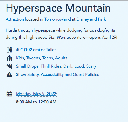 Again, this version of the attraction will only be around for a limited time. Right now, the calendar only lets us see through May 9th, and it does show operating hours for Hyperspace Mountain at least through that time. As the calendar allows guests to view more dates, we may see more dates on which this will be available.