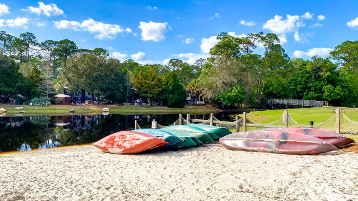 Like other hotels, there are rental options where you can snag bikes, fishing supplies, and boat rentals. BUT, this spot also has access to canoe and kayak rentals so you can have a watery afternoon! And, you can find sports courts around the property too with games like tennis, volleyball, basketball, shuffleboard, and tetherball!