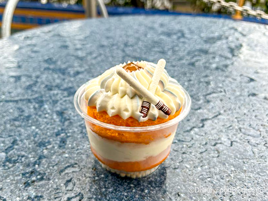 This new treat is made of layers of orange sponge cake, white chocolate mousse, and orange marmalade — topped with whipped cream and candy lightsabers!