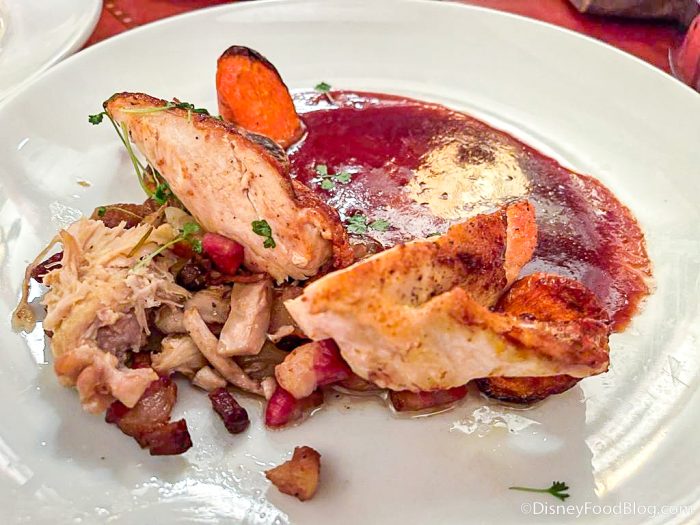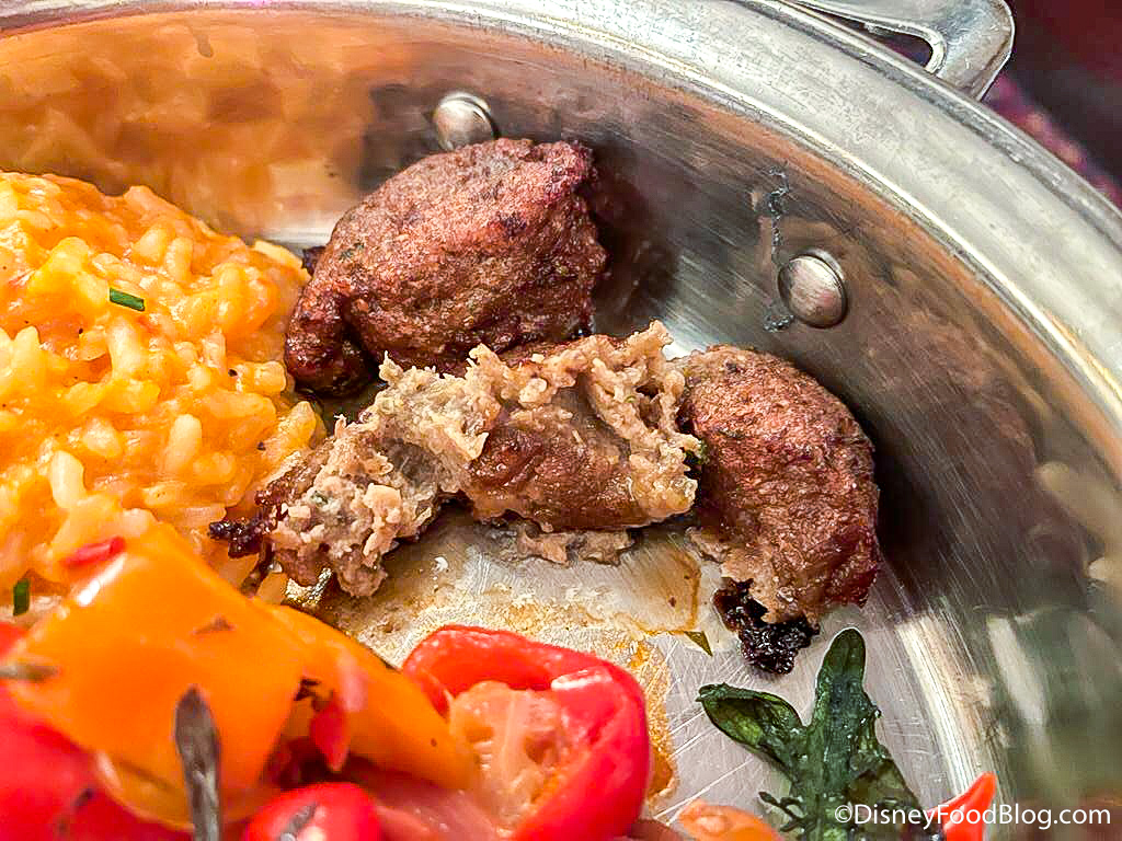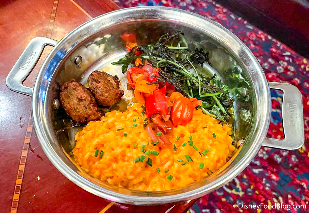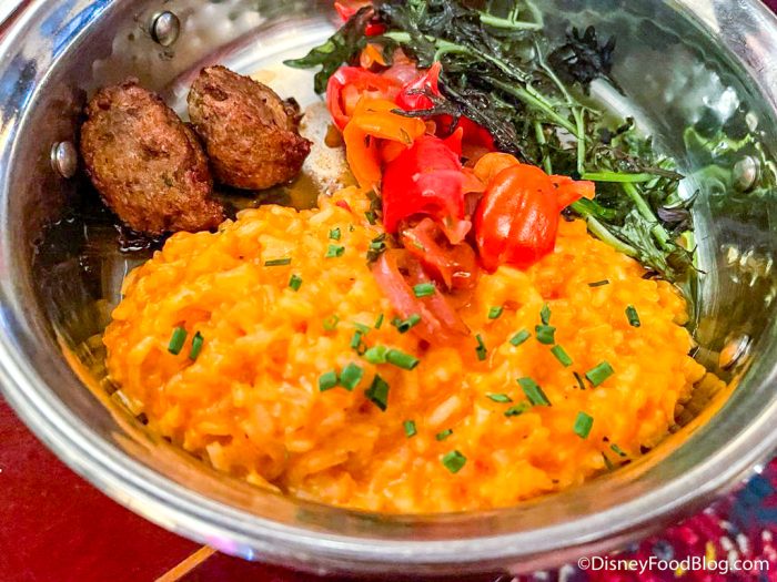 Moving on to the Tomato Risotto (another NEW dish), this comes with Eggplant Fritters and Pepper Relish for $29. This is a vegetarian option, and while our server said it is plant-based, it is not specifically marked that way on Disney’s online menu, so be sure to double check before you order it!