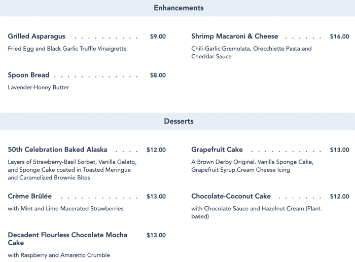 You can also get enhancements added onto your meal here, like the new Shrimp Macaroni & Cheese or Spoon Bread. For dessert, there’s a 50th Celebration Baked Alaska and the iconic Grapefruit Cake, among other picks.