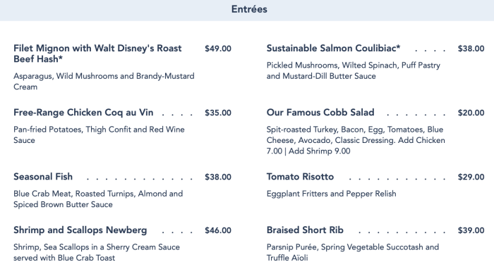 For Entrees, there is a special Filet Mignon on the menu right now for the 50th anniversary, and also the Famous Cobb Salad! Some of the new dishes include the Tomato Risotto and Braised Short Rib. What was previously the Trout Amandine has also been replaced with a “Seasonal Fish,” though they contain the same description about the blue crab meat and other accompaniments.