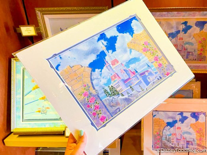 At Bonjour Village Gifts, we saw a couple of artistic souvenirs that you can grab to commemorate your Disney vacation. There’s a print of the Beauty and the Beast Castle Painting by Rosemary Begley available for $30…